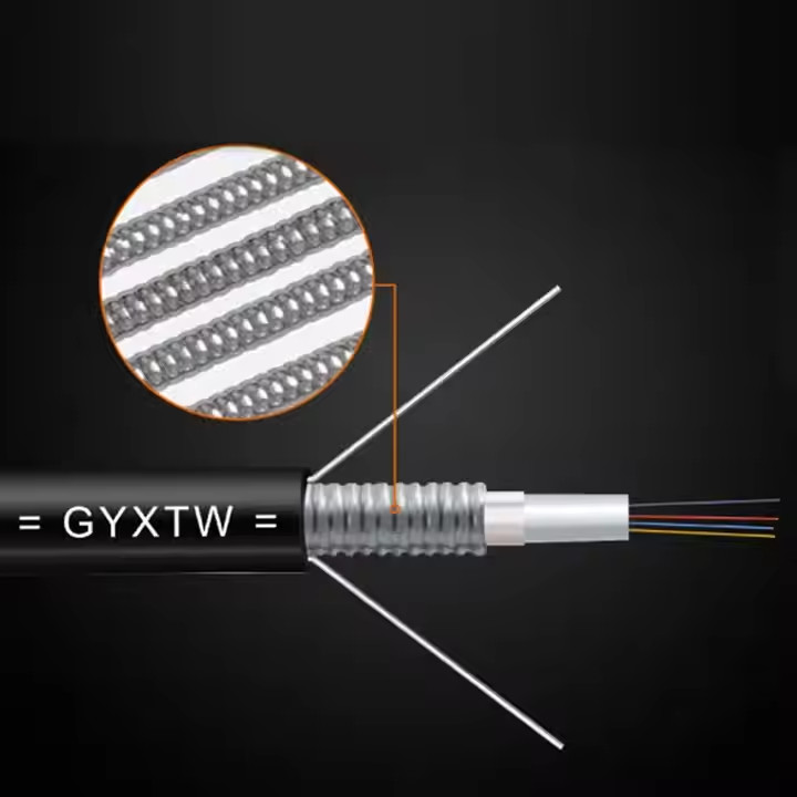 تعتمد كابلات الألياف GYXTW على ألياف أحادية الوضع أو متعددة الأوضاع موضوعة في أنبوب فضفاض مصنوع من البلاستيك عالي القوة، مملوء بهلام مقاوم للماء. يتم لف طبقة PSP طوليًا حول الأنبوب، بينما تملأ المواد المانعة للماء الفجوات لضمان هيكل مضغوط ومقاومة موثوقة للماء. يعزز سلكان فولاذيان متوازيان قلب الكابل، ويتم حماية الهيكل بأكمله بغلاف خارجي من البولي إيثيلين.